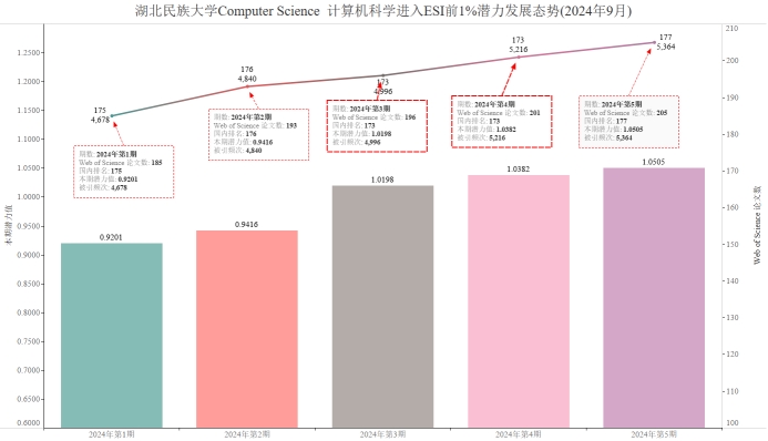 本期我校有望进入ESI前1%的学科Computer Science 计算机科学,潜力值为1.0505,论文数205,引用量5364,本期入围阈值5106。