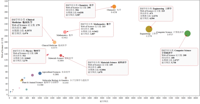 表2为本期我校ESI分类各学科态势情况,发文量、被引频次与潜力值的分布,球越大表明潜力值越高,当中Engineering工程学已经入围,潜力值最高的为计算机科学。
