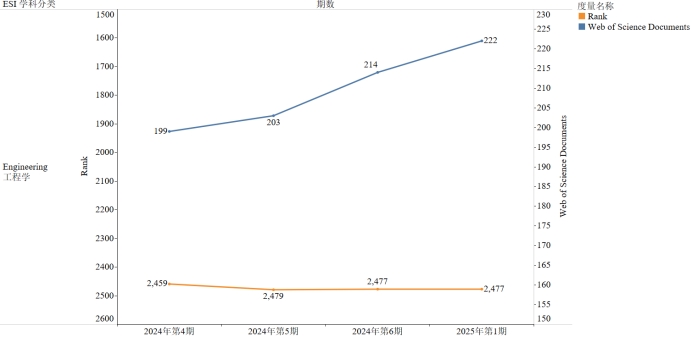 根据基本科学指标数据库(Essential Science Indicators,简称ESI)2025年1月9发布的最新数据显示(2025年1月9日更新,数据涵盖10年10个月:2014年 - 2024 年10月),本期共有9717家研究机构进入ESI全球前百分之一,我校有Engineering工程学1个学科进入全球前1%,本期我校共有WOS论文1860篇,总被引24221次,高被引论文26篇,热点论文0篇。如图1所示Engineering工程学共有WOS论文222篇,总被引4140次,篇均被引18.65次,高被引论文12篇。
