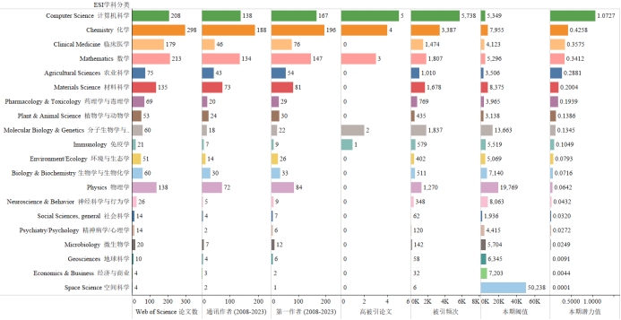 本期我校ESI学科分类数据来看,发文量最多的学科为Chemistry化学298篇,引用量最高的学科为Computer Science 计算机科学5738,潜力值最高为1.0727。由于潜力值比实际略有偏高,尽管本期Computer Science 计算机科学潜力值大于1,该学科本期仍尚未进入ESI学科前1%。