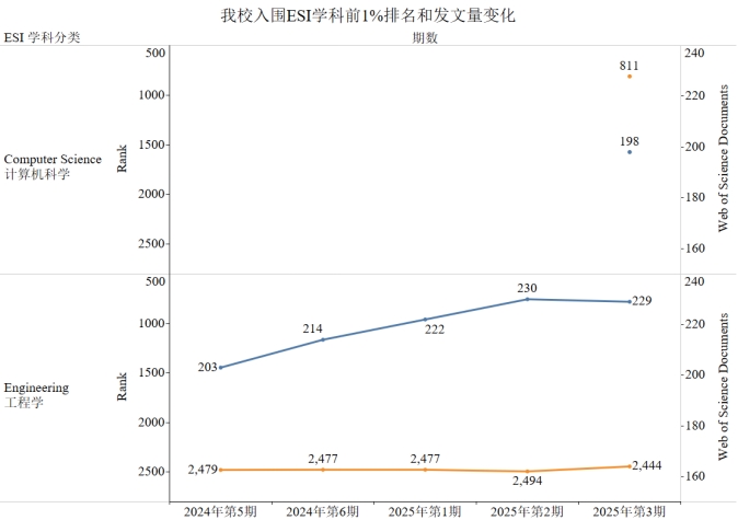 根据基本科学指标数据库(Essential Science Indicators,简称ESI)2025年5月8发布的最新数据显示(2025年5月8日更新,数据涵盖10年2个月:2015年- 2025年2月),本期共有9718家研究机构进入ESI全球前百分之一,我校Computer Science计算机科学首次入围ESI学科前1%,该学科共有WOS论文198篇,总被引5487次。此外,我校还有Engineering工程学进入ESI学科前1%,如图1所示Engineering工程学共有WOS论文229篇,总被引4280次,篇均被引18.69次。