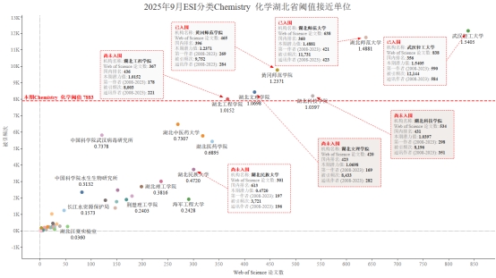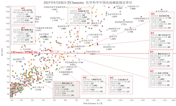 本期我校有望进入ESI前1%的学科Chemistry化学学科,潜力值为0.4720,论文数301,引用量3721,本期入围阈值7883。