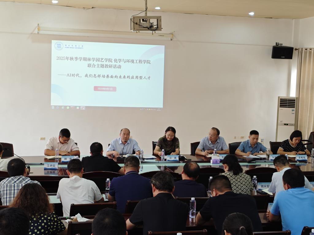 2025年9月1日,林学园艺学院与化学与环境工程学院在生物资源保护与利用湖北省重点实验室二楼学术报告厅联合举办了2025年秋季新学期以“AI时代,我们怎样培养面向未来的应用型人才”为主题的教研活动。副校长李军、学校本科教学检查组第6组成员,以及两院领导班子、教学管理人员、系主任和部分专任教师出席本次教研活动,本次活动由研究生处处长汪燕主持。
