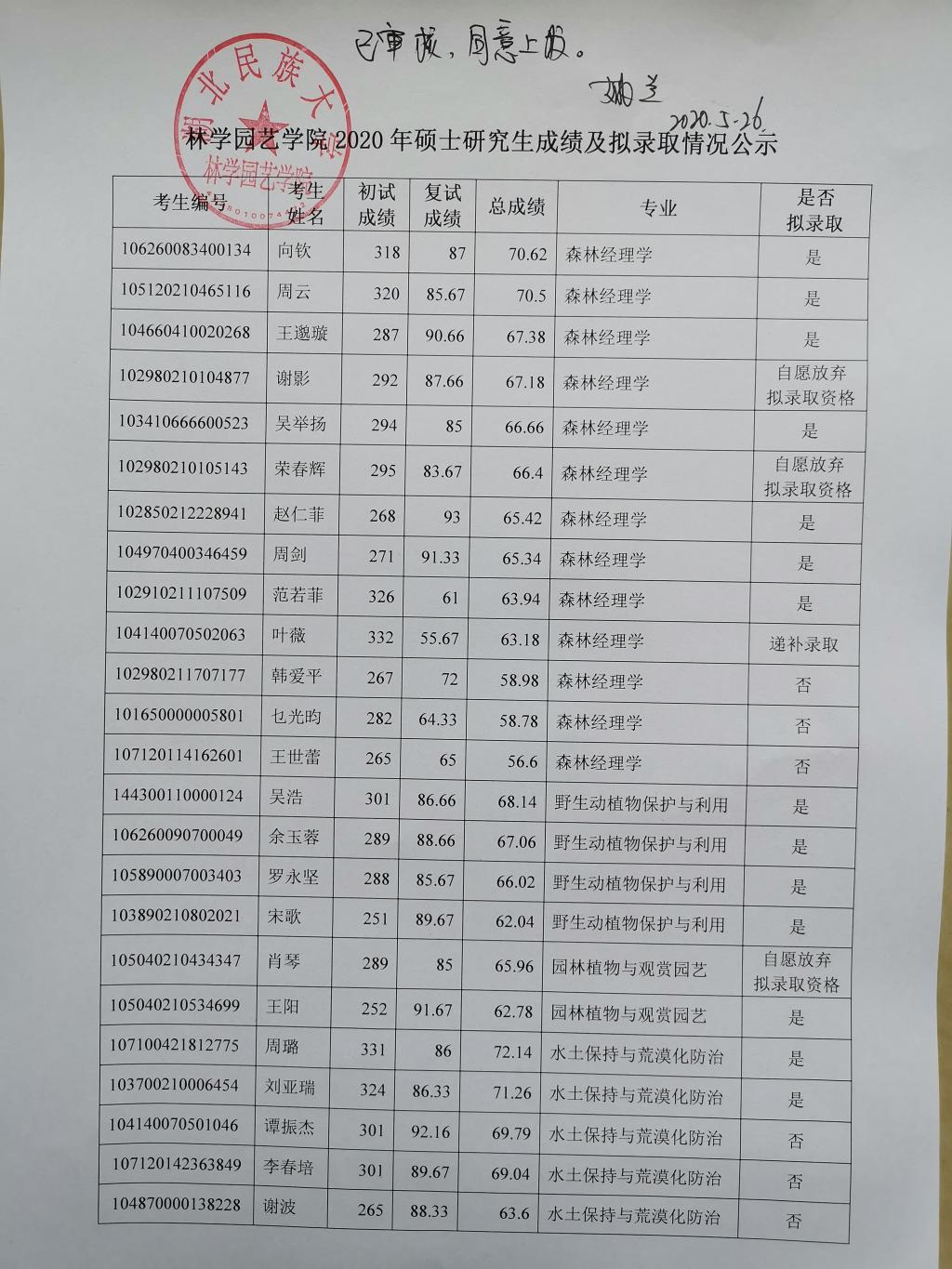 林学园艺学院2020年硕士研究生成绩及拟录取情况公示
