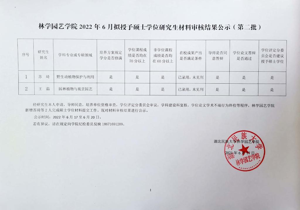 林学园艺学院2022年6月拟授予硕士学位研究生材料审核结果公示(第二批)