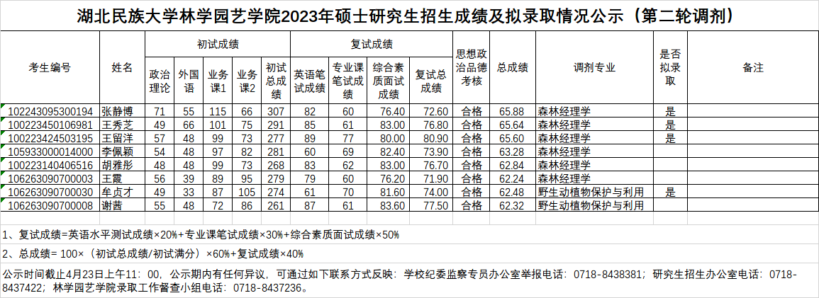 林学园艺学院2023年硕士研究生招生成绩及拟录取情况公示(第二轮调剂)