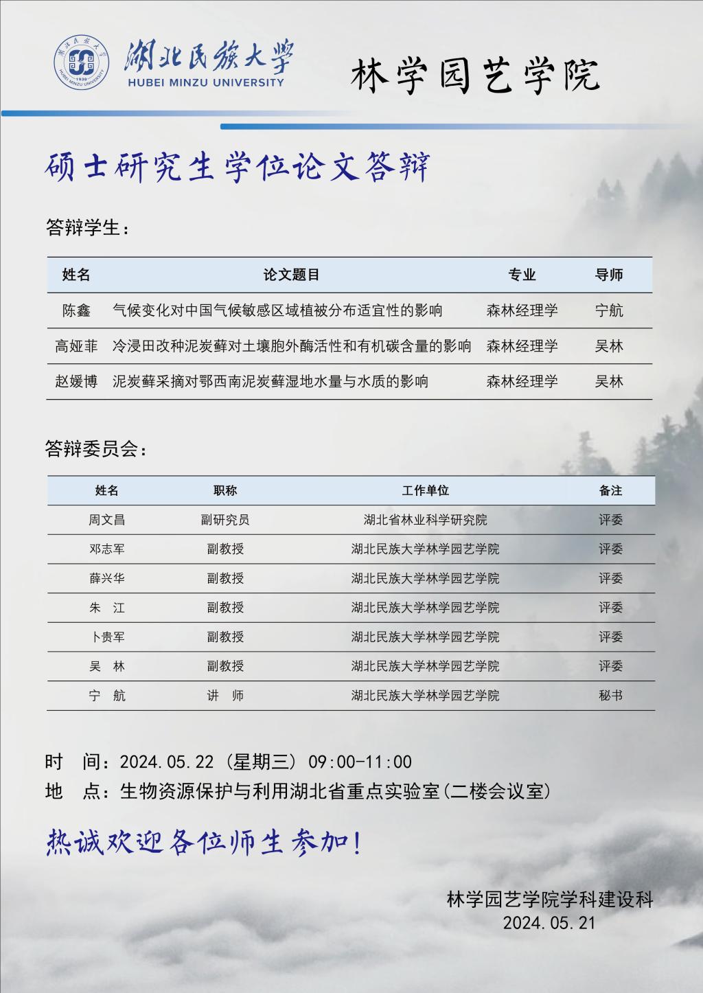 林学园艺学院2024届硕士研究生学位论文答辩公告(五)