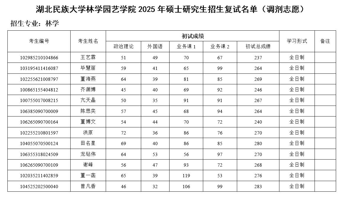 林学园艺学院2025年硕士研究生招生复试名单(调剂志愿)