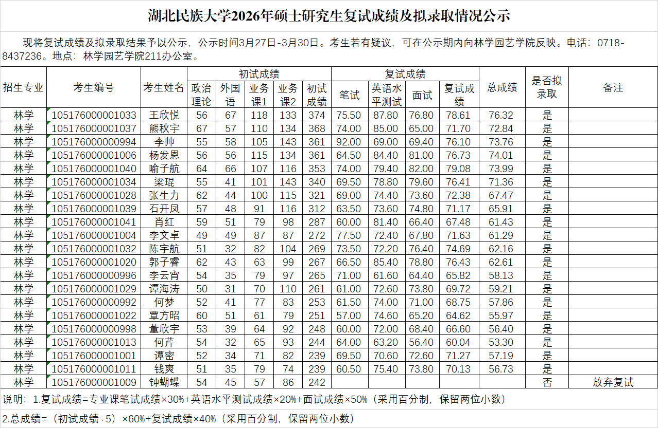 林学园艺学院2026年硕士研究生复试成绩及拟录取情况公示(第一志愿)