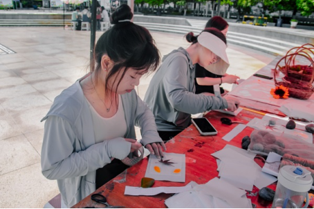 “植物拓印”环节,参与者可从工作人员采集的不同植物样本中挑选出心仪植物,覆于拓印布上,通过石块敲击布面,将新鲜植物样本的汁水印在拓印布上布面上的拓印浮现夏天的花影。活动趣味盎然,精美的作品吸引人群驻足观望