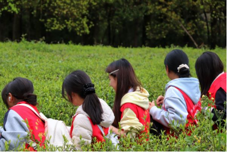 同学们在茶园中认真采摘