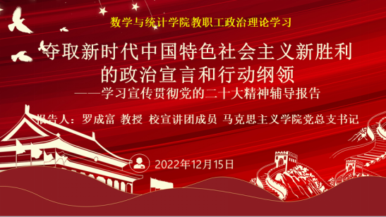 12月15日,数学与统计学院组织专题辅导报告,深入学习宣传贯彻党的二十大精神。会议由学院党总支书记主持,全院教职工参加会议。