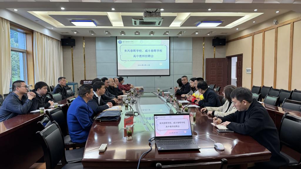 4月11日,由数学与统计学院举办的来凤春晖学校、咸丰春晖学校高中教师招聘会在学院四楼会议室成功召开。本次招聘活动由数学与统计学院学生科主办,招生就业与校友联络处处长向政以及相关领导参加,招聘教师面试评委由春晖集团董事长张昌奎、两所学校的校长以及老师担任。