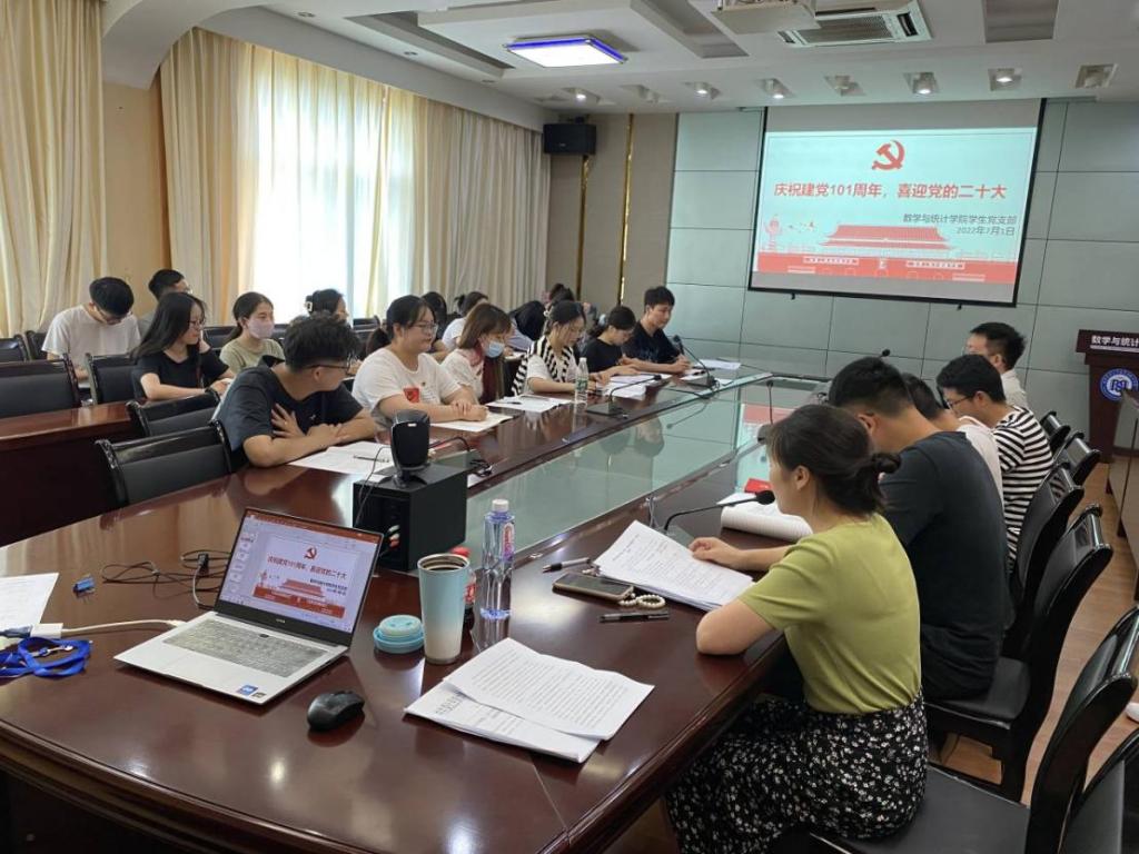 为了迎接党的二十大的召开为了庆祝建党101周年。2022年71日,我院学生党支部在数学与统计学院四楼会议室召开党员大会,开展庆祝建党101周年,喜迎党的二十大”为主题的支部主题党日活动。会议由支部书记黄丽娜同志主持。