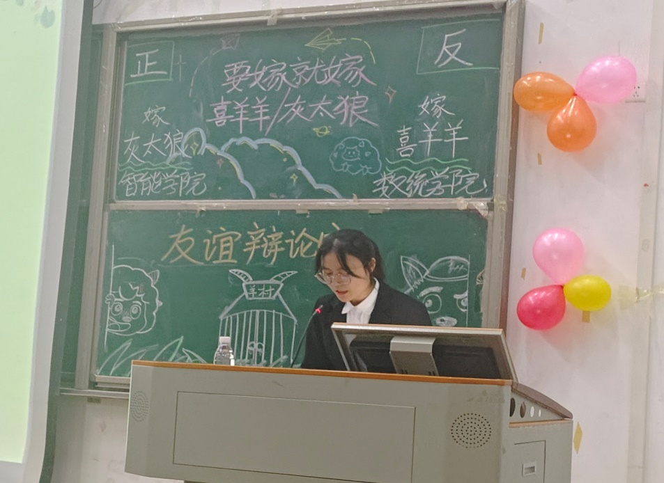 本网讯(记者 李畅 田学炜/文 李畅/摄)为丰富学生校园生活,促进学院交流沟通。10月21日晚,我院与智能科学与工程学院联合举办友谊辩论赛,本次辩论赛以“要嫁就嫁灰太狼还是喜羊羊”为辩题,我院刘新姿同学担任主持人。
