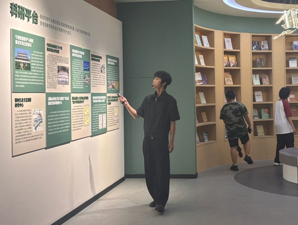 讲解员重点介绍了学校专业建设与科研成果。特别是李军教授将数字文化“织入”西兰卡普的创新实践,展示了学校在传承民族文化、推动数字技术融合方面的重大探索与成就,让同学们印象深刻。同时,校史馆还展示了学校近年来服务地方经济社会发展的重点项目和未来发展规划,勾勒出民大建设高水平大学的美好蓝图。