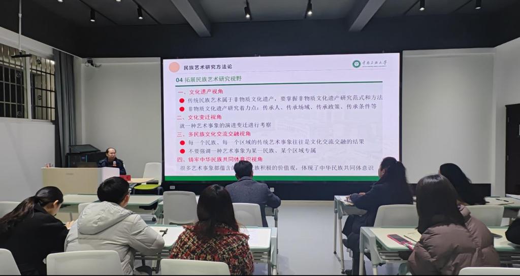 12月4日,中南民族大学教授段超在我院举办了"民族艺术研究方法"的专题讲座,本次讲座专业性强、立意深远、思想深刻,对我院构建先进的民族艺术学知识体系具有十分重要的指导意义。(段超,中南民族大学党委常委、副校长、二级教授、博士生导师,校学位评定委员会主席,中国民族学会副会长、中国民族史学会副会长、湖北省社联副主席,中南民族大学四部委铸牢中华民族共同体意识首席专家,入选中组部国家“万人计划”哲学社会科学领军人才,享受国务院政府特殊津贴专家。)讲座由院长谷秋阳主持,音乐舞蹈学院全体教师积极参加、认真聆听,并与段超教授和谐互动,提升了教师们对“民族艺术研究方法”的理解和更深层次的认知。