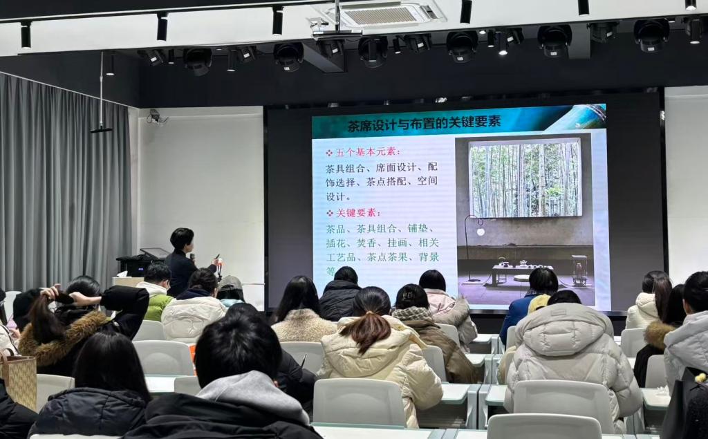讲座以“茶席——方寸之间的生命美学”为命题,以“茶席”的起源与定义为切入点,梳理了茶席从传统文人茶会空间到当代生活美学场景的演变脉络,结合茶品、插花、挂画、铺垫选择、茶具配备等茶席设计的基本要素,详细阐述了茶席设计的要素美学、结构美学、设计技巧和创新美学等核心内容,诠释了茶席作为“集泡茶操作、宾客互动、意境营造于一体的综合艺术空间”的文化内涵与学术价值。