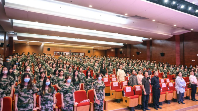 活动当天正值教师节,“赤诚浇新花,丹心映日月,秋果结累累,桃李满天下”。在典礼开始前,21级新生为音乐舞蹈学院的全体老师们献唱了一首《感恩的心》。随后,开学典礼在庄严的国歌中拉开了帷幕。