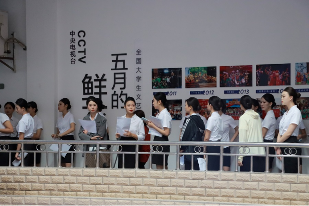 候场室内,音乐舞蹈学院老师紧锣密鼓地对学生进行队列编排,学生编组进入面试室。学生手持面试资料,有序排队,进行身份验证、佩戴号码牌等相关工作,现场秩序井然。