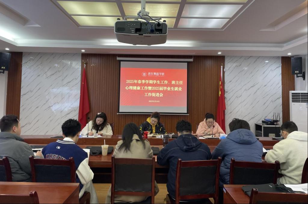 2月16日,音乐舞蹈学院2025年春季学期第一次学生工作大会于学院四楼会议室召开,专题部署2025年春季学期学生工作、班主任心理健康工作及毕业生就业工作,学院党总支书记张蕊出席会议并讲话。会议由党总支副书记邓丽主持,全体辅导员、班主任参加会议。