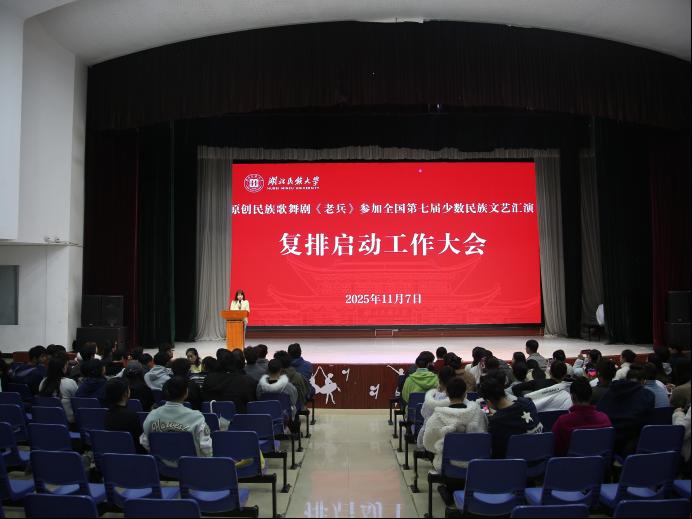 2025年11月7日,音乐舞蹈学院召开“原创民族歌舞剧《老兵》参加全国第七届少数民族文艺汇演复排启动工作会议”。副院长焦娜主持会议,院长谷秋阳、党总支书记张蕊分别发表重要讲话。学院领导班子成员、教师代表、复排指导老师和参演学生参会。