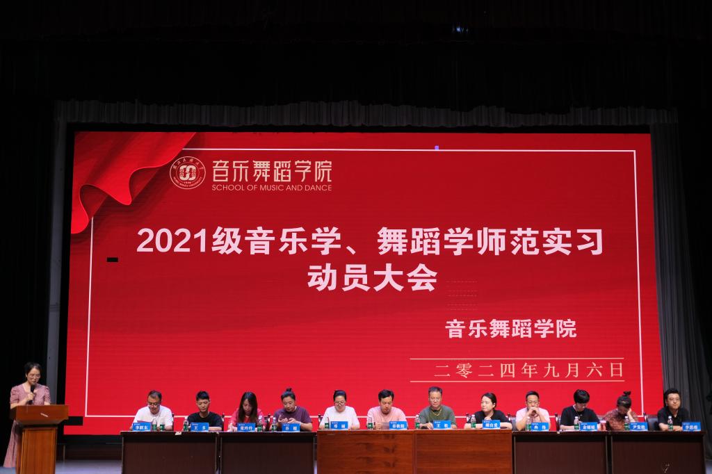 为保障2021级师范生教育实习顺利进行,我院于2024年9月6日在音乐舞蹈学院演播厅召开教育实习动员大会。学院院长谷秋阳、党总支副书记邓丽、副院长王松,音乐学专业负责人张玲玲、舞蹈学专业负责人余媛媛,2021级音乐学班主任李跃东、舞蹈学班主任李思维及学院各科室负责人出席此次活动。