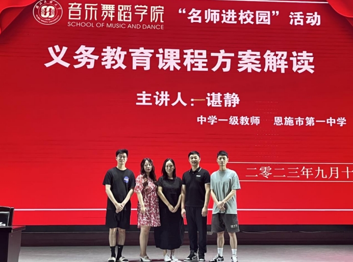 9月14日下午,恩施市第一中学音乐教师谌静应邀来我院开展名师进校园专题讲座。本次讲座在演播厅举行,主题为《义务教育课程方案解读》,由美育中心主任王多副教授担任主持人。学院2021级音乐学、舞蹈学,2022级音乐学专业全体学生聆听了此次讲座。
