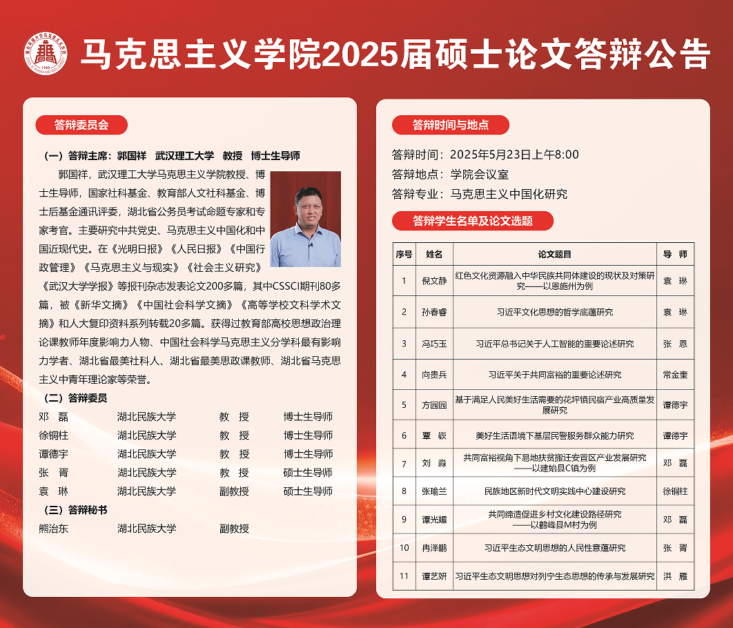 马克思主义学院2025年春季硕士研究生毕业论文答辩公告(一)
