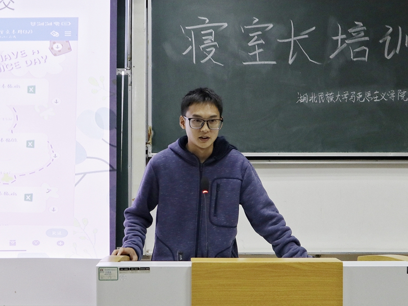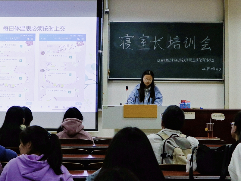 吴思霞就疫情防控、基础设施和宿舍关系三方面展开详细讲解。她指出要注意安全用电,对于宿舍安全问题及时拨打保修电话,预防风险;注重寝室卫生,保持寝室干净整洁,建设文明寝室;处理好寝室成员之间的关系,保持宽容、大度的心理,及时感知周围舍友的细微情绪变化,积极引导与调整。另外,要加强疫情防控,寝室长要按时上交体温监测表。随后,我校校公寓部成员李岱对寝室长进行寝室安全及卫生培训。他指出寝室卫生应符合寝室卫生规定,严格遵循管理制度,禁止使用违规违禁用品。最后,李岱建议寝室长积极与公寓管理委员会加强沟通与交流,以便寝室问题的及时处理。