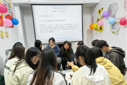 活动分为心理健康教育解压游戏和交流分享三个环节。活动过程中,心理健康工作室成员就心理健康定义、大学生心理健康现状、缓解心理压力的办法及送给大学生的忠告等方面进行分享,着重讲解心理调适方法,以期帮助参与者提高自我调节能力。在“我的压力”绘画接力和“猜词卡”趣味游戏中,参与者沉浸其中,在欢声笑语中释放压力,用肢体语言传递欢乐,营造了轻松愉快的氛围。
