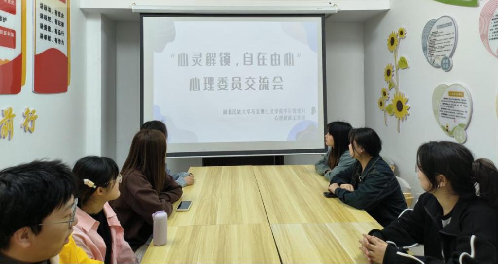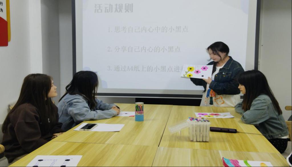 杨婷老师以“学生干部在大学生心理危机干预中的作用”为主题,带领在场的同学们进行了交流讨论,大家纷纷表示学生干部在大学生心理健康教育中发挥着越来越重要的作用。随后在场人员一同观看心理健康知识科普视频开展“心灵盲盒”“拥抱小黑点”等心理小游戏,在极具互动性与趣味性的活动中释放压力,增强心理健康意识。最后,与会人员深入交流,分享工作经验,集思广益共同总结有效的心理工作方法。