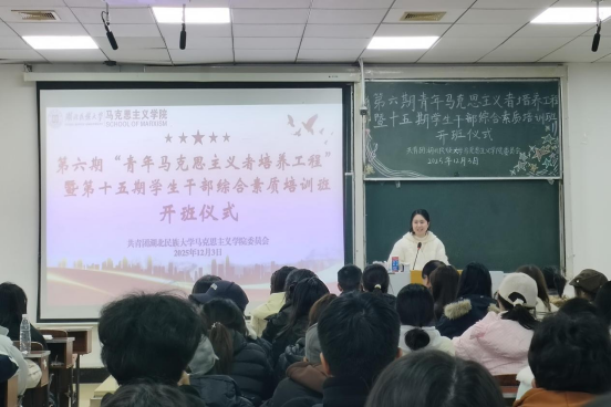 为深入学习贯彻党的二十届四中全会精神引导青年学生骨干坚定理想信念、勇担时代使命,123日,我院在德智楼9B210教室举行第六期“青年马克思主义者培养工程”培训班暨第十五期学生干部综合素质培训班开班仪式。学院院长徐铜柱、党总支书记向驰、党总支副书记欧玲、学生科科长杨婷受邀出席,我院第六期青马学员、2025级全体学生干部参与活动仪式由我院团委副书记汪丽娟主持。
