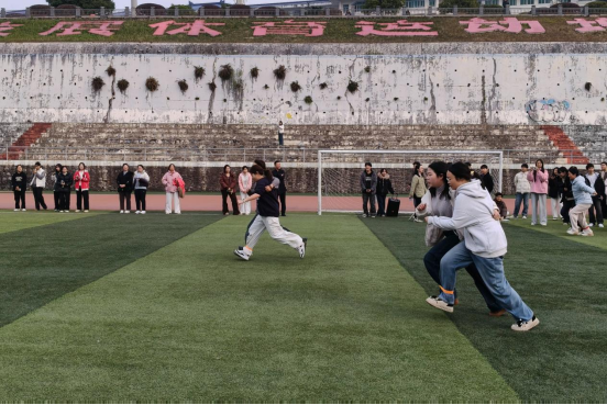 本次活动设置“两人三足”“同心击鼓挑战”“迎面接力跑”“拔河比赛”“零食大作战”五项兼具趣味性与协作性的竞技项目。赛场上,“友谊第一,比赛第二”的信念深植每位同学心中,各班班主任全程参与游戏环节,与学生默契配合、畅快交流。拔河比赛、迎面接力跑环节,每班均派出4名男生与14名女生组队参赛;两人三足项目每班10组队员分成两队接力比拼;同心击鼓挑战由向驰分别指导三个班级训练;零食大作战环节,各班班主任进入指定区域抓取零食,同学们在场外呐喊助威,现场气氛热烈高涨。紧张的竞技与爽朗的笑声交织,不仅让学生的学习压力烟消云散,更充分展现了班级的集体荣誉感与高效协作力。