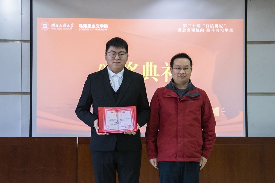 交流互动环节。田金爽就同学们提出的“如何实现学习生活和参加社会实践活动的平衡”进行详细回答。随后,马克思主义学院副院长张胥为田金爽颁发“优秀主讲人”荣誉证书。