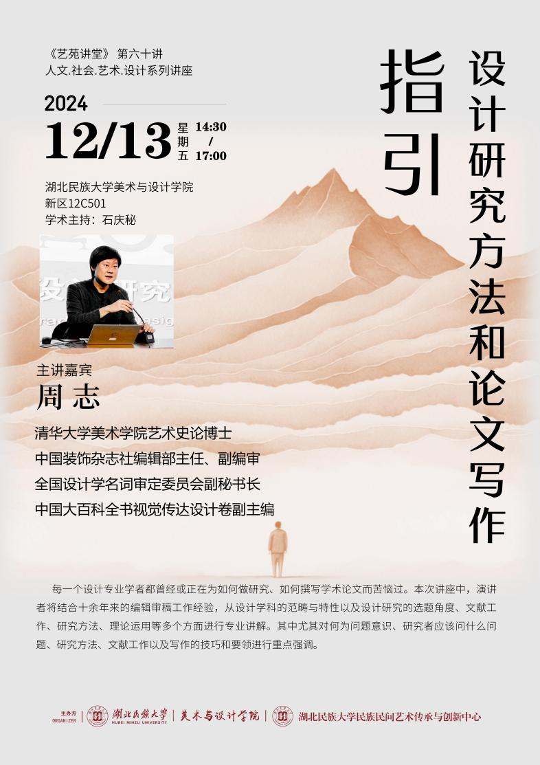12 月 13 日下午,清华大学美术学院艺术史论博士、中国装饰杂志社编辑部主任、副编审,全国设计学名词审定委员会副秘书长、中国大百科全书视觉传达设计卷副主编周志教授,应邀于我院 12B501 多功能教室举行了一场主题为“设计研究方法和论文写作指引”的学术讲座。此次讲座由院长石庆秘教授主持,吸引了我院以及其他学院的部分师生踊跃参与。
