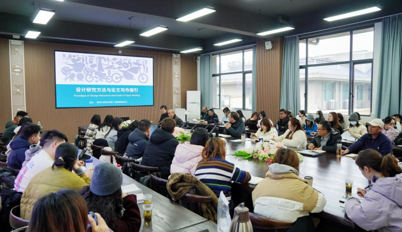 周志教授就设计研究方法和论文写作技巧这两个方面展开了详尽的阐述。他首先指明,当下设计领域存有“会写不会投”“会做研究不会写”“不会做研究”“不清楚学科定位”等诸多问题。鉴于此,周教授着重强调了学科定位的关键意义。以层层深入且通俗易懂的方式介绍道,设计研究乃是一个知识增量的进程,不但涵盖理论研究,还牵涉历史、考察、实验以及实践等众多方面。其尤为凸显了设计思维的重要性,指出这是一种以解决问题为导向的思考活动,既要“做正确的事情”,也要“把事情做正确”。接着,周教授分享了撰写学术论文的首要步骤是从问题着手,明晰研究问题的类别,并细致地介绍了“如何开展文献综述、选取研究方法、构建论文结构以及撰写导言、主体和结论的具体方式”。他认为,论文写作的关键在于尊重读者,保证标题富有吸引力、结论具备启发性、论证富有说服力。讲座结束后,现场师生踊跃提问,周教授耐心地为大家答疑解惑,气氛热烈非凡。