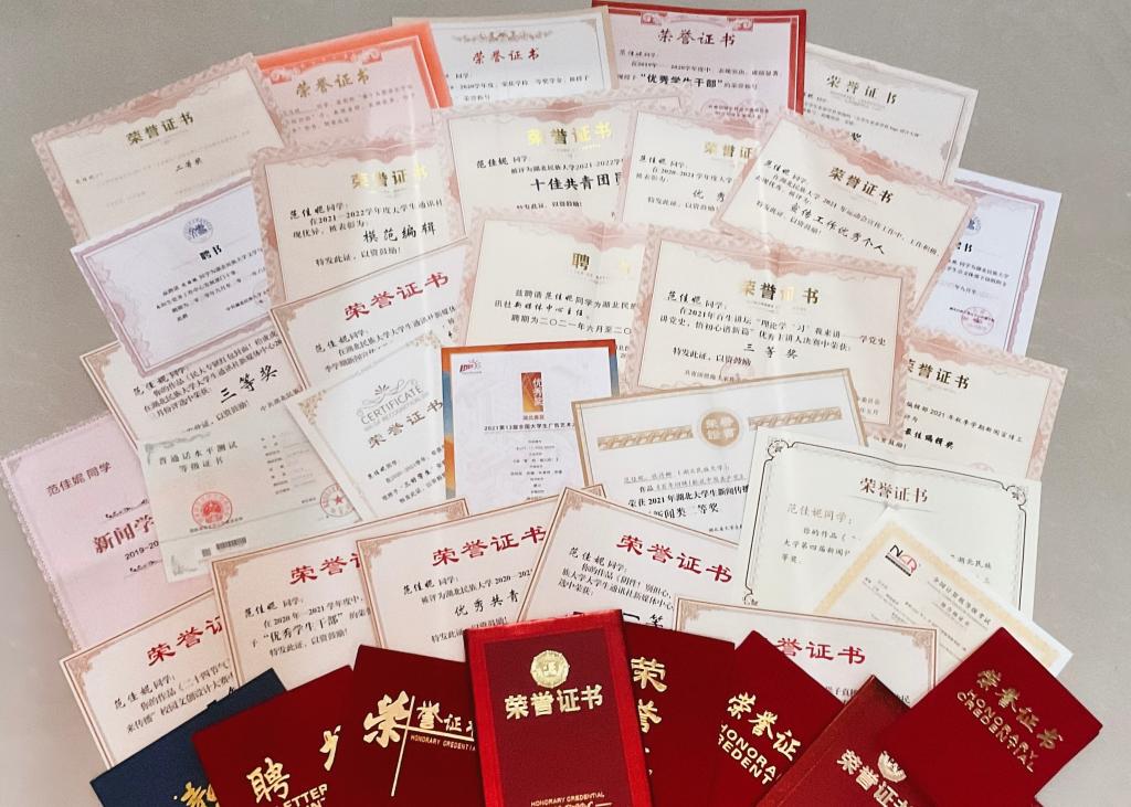 注:范佳妮曾获2021-2022学年度国家奖学金;2019-2020学年度和2020-2021学年度一等奖学金以及三好学生、优秀学生干部荣誉称号;2020-2021学年度和2021-2022学年度优秀团员、优秀编辑、宣传工作优秀个人、最佳编辑、十佳编辑奖等;新闻学子奖;大学生求是学社logo设计大赛一等奖;寝室短视频大赛三等奖;校百生讲坛优秀主讲人;湖北省新闻传播实践技能竞赛省级二等奖、校级二等奖一项、三等奖三项;第十三届大广赛省级优秀奖;第十四届大广赛省级二等奖;新媒体原创作品一等奖;第七届“互联网+”大学生创新创业大赛校赛银奖;第四届新闻传播类原创作品大赛三等奖等。