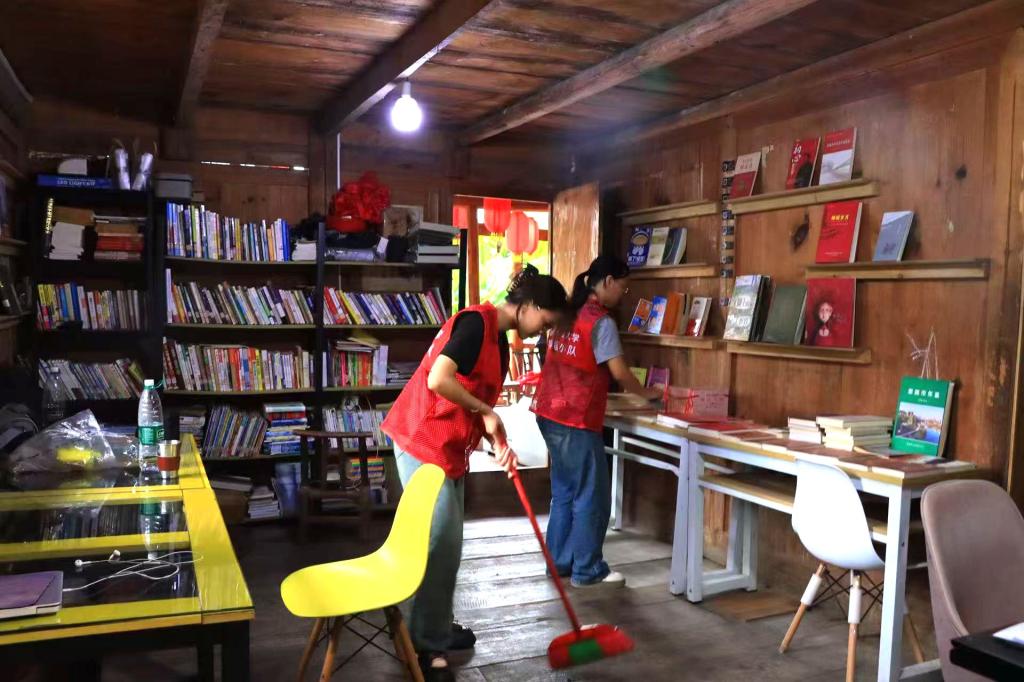 活动现场,队员们先对图书馆的三个藏书房间进行打扫。他们细致擦拭书架、清扫地面。完成馆内清扫后,队员们开始擦拭图书,并搬到院坝里晾晒,在大家的共同努力下,原本蒙尘的泛黄书页重焕整洁。