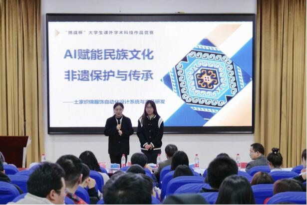 在项目陈述环节,各项目负责人通过PPT路演和作品展示,分别从项目背景、项目介绍、项目机会及总结展望等方面对作品进行讲解和介绍。4号作品《土家织锦服饰自动化设计系统与产品研发》,项目负责人表述准确,向评委讲解设计理念、产品服务平等,同时,对西兰卡普进行数字化的修复做了详细解说。22号项目《扫雪先锋——人工智能扫雪机》项目,分析通过设计屋顶智能扫雪机,以提高除雪工作的效率的创作背景,从智能扫雪机的结构设置、产品优势等方面讲解,指出智能除雪机具有广阔的前景。现场提问环节,评委根据作品特点,进行提问,各答辩选手从容不迫对作品进行解释,逻辑清晰、条理清晰。