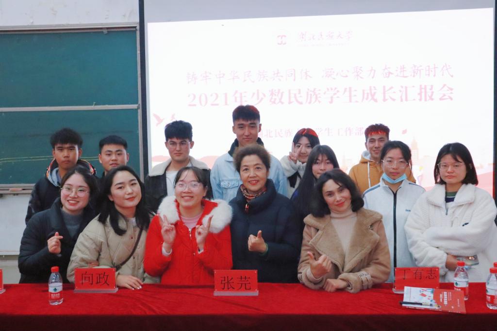 随后,播放优秀少数民族毕业生寄语视频。我校三位优秀新疆籍少数民族毕业生阿尔祖古丽·阿卜杜热西提、热依汉古丽·麦麦提敏、迪力木拉提·木合塔尔分别就个人的校内成长、工作现状进行分享,他们表达了对母校的感激之情和真挚祝福,展示出了我校各族青年团结奋进新征程的精神风貌。