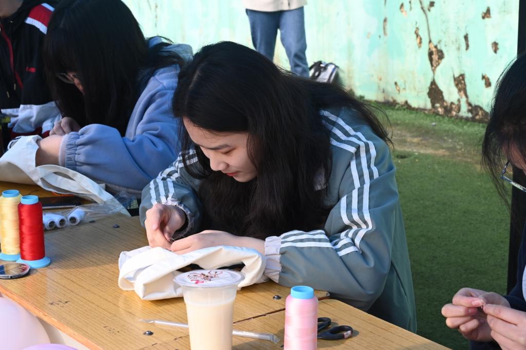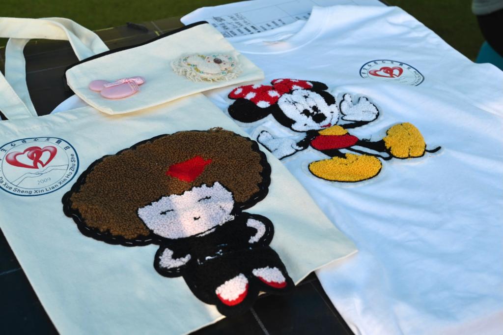 活动共设置两个摊位,以帆布袋、包包和T恤衫作为设计材料,提供缝、绣、贴等多样化形式方法,让参与者充分发挥想象力、创造力编织独特手工艺作品。参与者沉心静气认真缝制,一针一线皆是爱心,一点一滴铸就希望。优秀作品《花漾年华》等挂在帐篷前方展示。