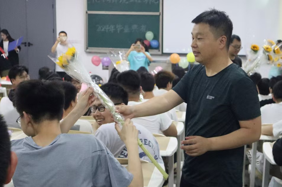 班主任为毕业生递上向日葵,并送上真挚的祝福。