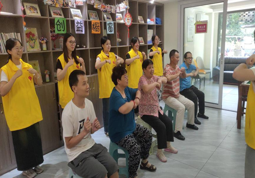 志愿者们还带领社区精神障碍康复患者学习《清凉拍拍操》。在领操员的带领下,大家跟随音乐的节奏,通过拍打身体的不同部位来释放身体的热量和紧张感。这种简单而有趣的手势舞不仅能够帮助他们降温消暑,还能够提高他们的身体协调性和灵活性。
