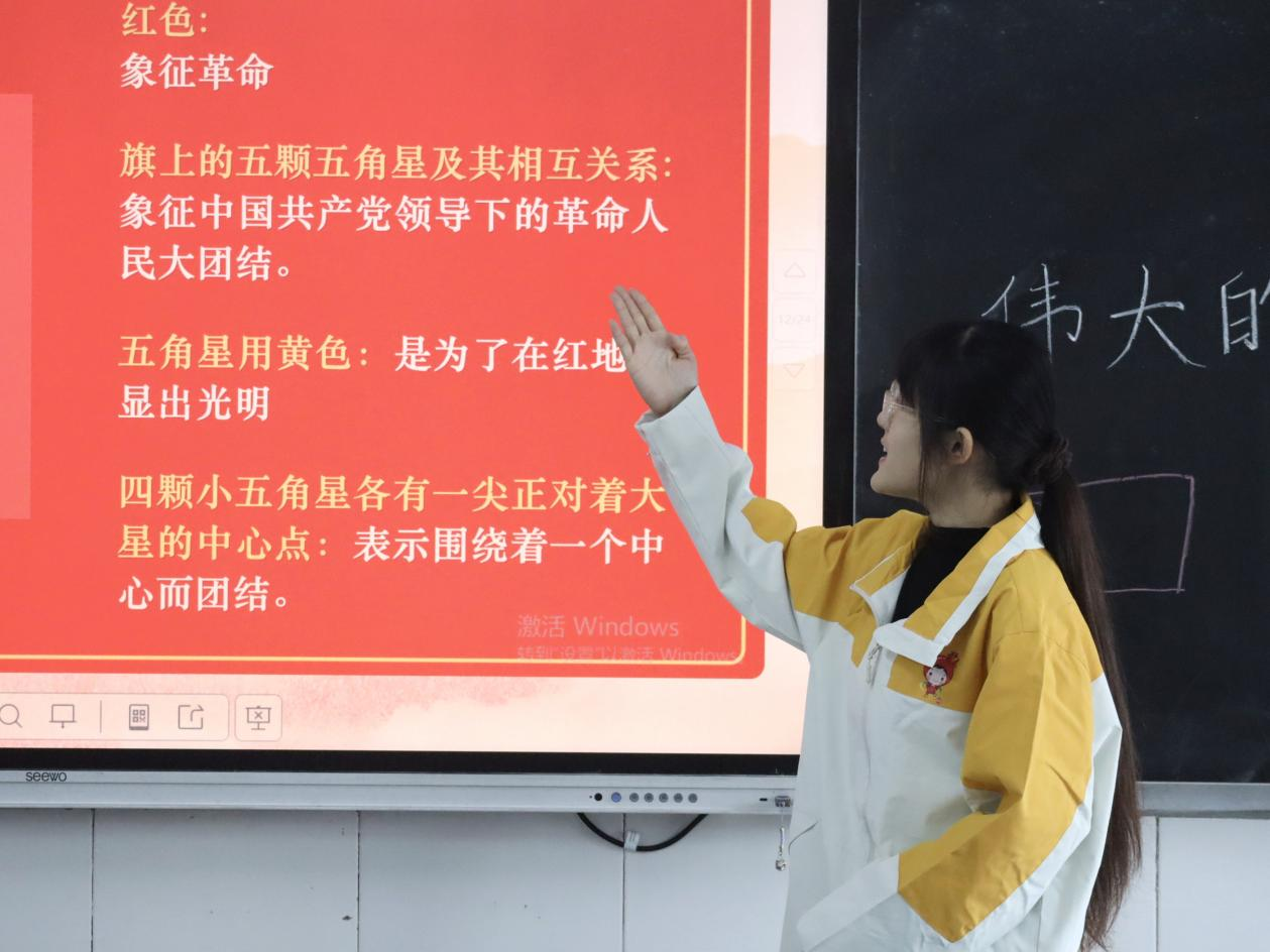 本次宣讲以“我们伟大的民族精神”为主题。活动伊始,各组利用红彤彤的石榴生动形象为学生们讲解“红石榴”宣讲团的名称由来,让学生们深刻理解“各民族要像石榴籽那样紧紧抱在一起”的意义。而后,宣讲团成员为学生们讲解五星红旗的来源及含义并鼓励学生们亲手绘制五星红旗。宣讲过程中,宣讲团成员们对爱国主义进行重点讲解,他们用生动的图片与视频资料展示了近年来我国取得的辉煌成就,生动诠释了中华民族团结奋斗的伟大力量。最后,宣讲团成员们与全体学生齐跳“民族健身操”,伴随着“五十六个民族在一起,富强咱的大中华”的歌声,学生们认真学习带教舞蹈老师的动作,将朝气注入舞步。