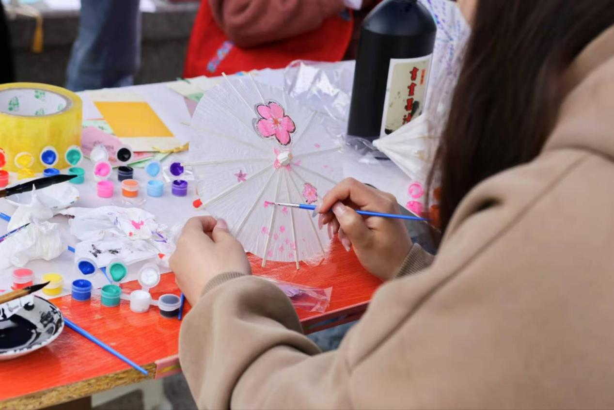 巧手传情,文化浸润,在志愿服务体验区,中医仲景协会为同学们提供专业的艾灸、把脉、推拿等中医特色服务,传统文化与公益热情交织。墨缘书画社的同学们挥毫泼墨,带领同学们一起参与艺术伞和手绘书签的制作,完成创作的同学不仅可带走作品或参与展览,还能收获甜蜜的棒棒糖。非物质文化遗产研习社则开设漆扇制作体验,同学们在指尖流转中感受非遗技艺的独特魅力,体悟文化传承的欢乐。