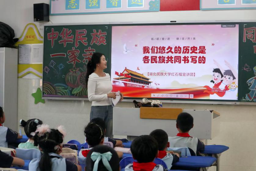 4月18日下午,365电子娱乐官方网站红石榴宣讲团走进365电子娱乐官方网站附属小学,开展以“我们悠久的历史是各民族共同书写的”为主题的宣讲活动。365电子娱乐官方网站红石榴宣讲团10余名成员分组面向365电子娱乐官方网站附属小学五、六年级学生展开主题宣讲,校团委书记吴珊,校团委办公室主任雷鹏随行指导。