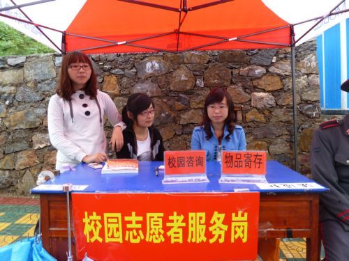 本网讯(记者:李子怡)人的生命是无限,可是,为人民服务却是无限的。9月8日为2011级新生报名的第二天。虽然淅沥沥的小雨任然下个不停,但我校志愿者考虑到新生报名的各种需要,特在学校大学生广场、桂花园广场、科技食堂口、舞阳坝校区等各大人流汇聚点设立了志愿者校园服务岗。
