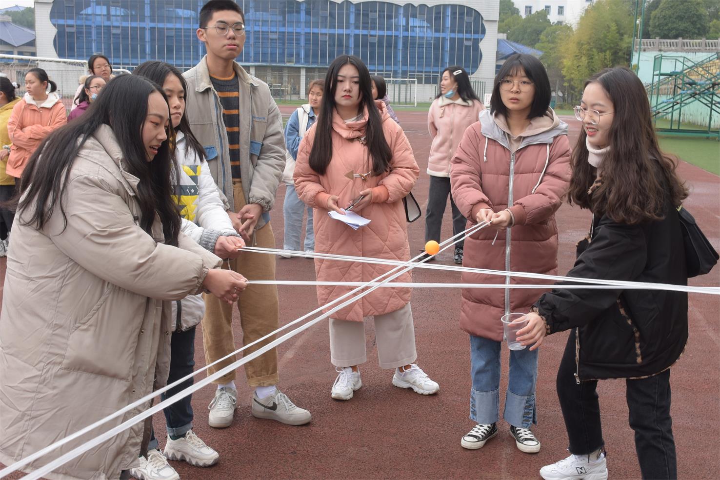 本次授课共有“暖身跑”、“踩气球”、“线上乒乓球”、“九宫格”和“盲人摸巷”五个活动环节。活动伊始,所有成员按预先分组进行暖身跑。在“踩气球”环节中,四队成员两两分组,以两人三足的形式进攻或保卫气球,现场气氛逐渐活跃。随后的“线上乒乓球”则是需要团队成员齐心协力让乒乓球通过线与线构成的轨道掉入杯中,这个游戏考验的是整个团队的合作能力。紧接着“九宫格”的参与者们需要分两队以对抗的形式跑到现场另一端并放下手中棋子使己方棋子更快连成一线,热情的欢呼、飞驰的身影,将本次活动推向了高潮。最后的“盲人摸巷”环节,所有人除了领头人外都需要蒙上双眼,并在领头人的引导下协力走过工作人员布置的障碍路线,而其他人则需要对行进的人员进行提示与守护,一条不长不短的小路反映的是一个团队的协作精神。