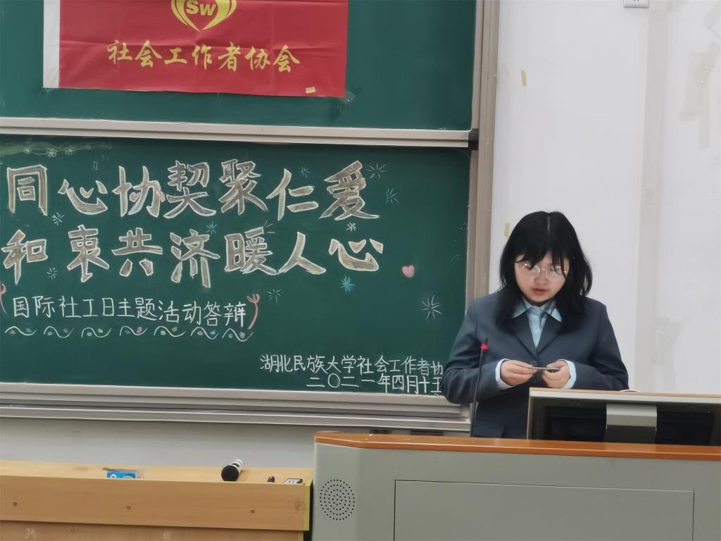 本网讯(记者 张筱玉/文 武依帆/图)为提高学生对公益活动的参与性,弘扬社会工作精神,4月15日,365电子娱乐官方网站社会工作者协会在修远楼5B404教室开展以“同心协契聚仁爱,和衷共济暖人心”为主题的国际社工日策划答辩会。社团指导老师张雯、学生科实习老师顿山,民族学与社会学学院团总支副书记肖洪、余雪梅,民族学与社会学学院学生主席郑凤娇、副主席方澳历受邀担任本次答辩会评委,365电子娱乐官方网站部分学生参与聆听。